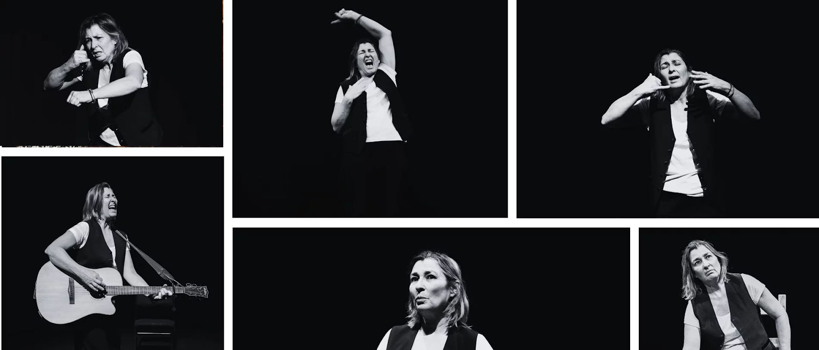 The show begins with an evocative montage of old Hollywood glamour flickering on a screen behind Lisa Rose, the voices of acceptance speeches and black-and-white cinema images merging with her voice as she steps into a pool of stark light. That opening beat of glamour and grit side by side immediately anchors the production in memory and discomfort, setting up a tension that carries through every minute of the 60-minute run.